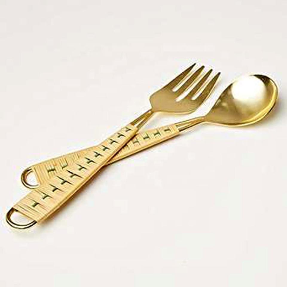 Rattan Wrap Handle Stainless Steel Gold Plated Salad Serving Fork and Spoon Set