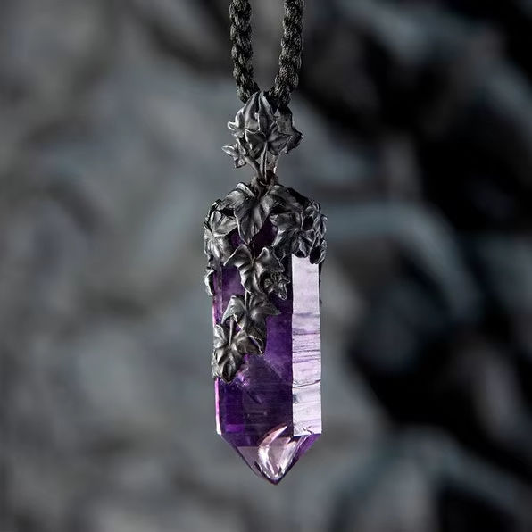 Raw Amethyst Crystal Necklace Deep Purple Patina Pendant Natural Healing Gemstone Art Nouveau Dark Magic HSP Gift