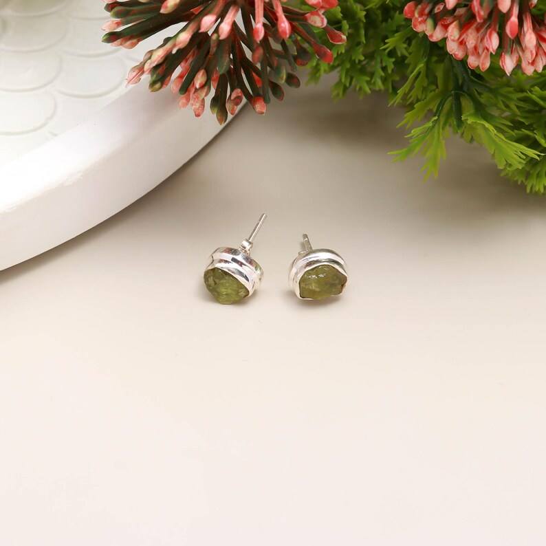 Raw Peridot Stud Earrings 925 Sterling Silver Handmade Natural Gemstone Jewelry