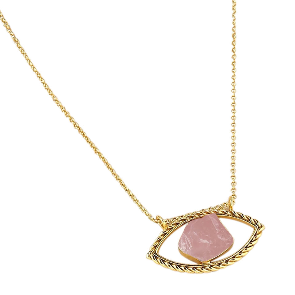Raw Rose Quartz Crystal Evil Eye Necklace Gold Plated Birthstone Healing Jewelry With Brass Material Main Stone Pearl