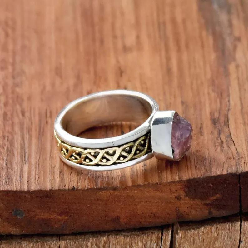 Raw Rose Quartz Spinner Ring 925 Sterling Silver Two Tone Meditation Waves Ring for Women Gift for Her