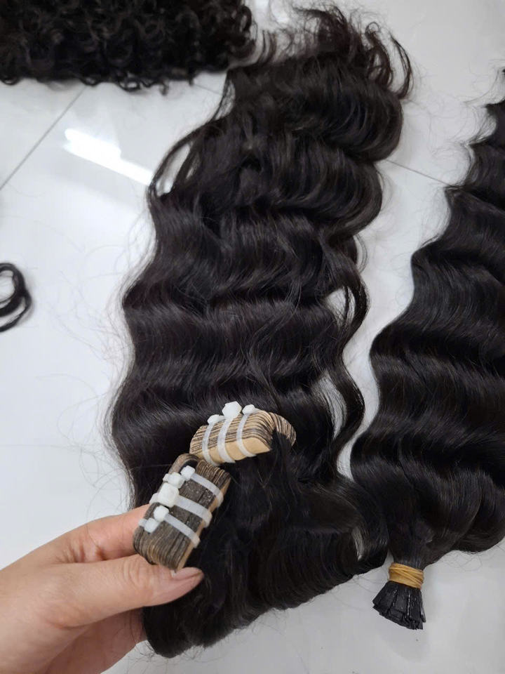 Raw Virgin Vietnamese Flat Tip K-Tip Loose Curly & Natural Wavy Tape in 1B Colour Human Hair Extensions from Vietnam
