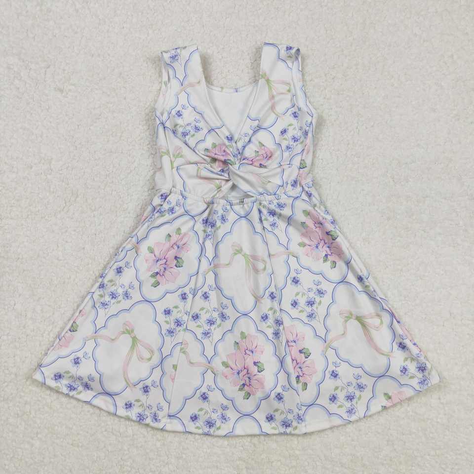 Ready Ship Wholesale Summer Kids' Casual Athletic Dress for Toddler Girls Floral Bow Print Sleeveless Dresses Stretchy Casual