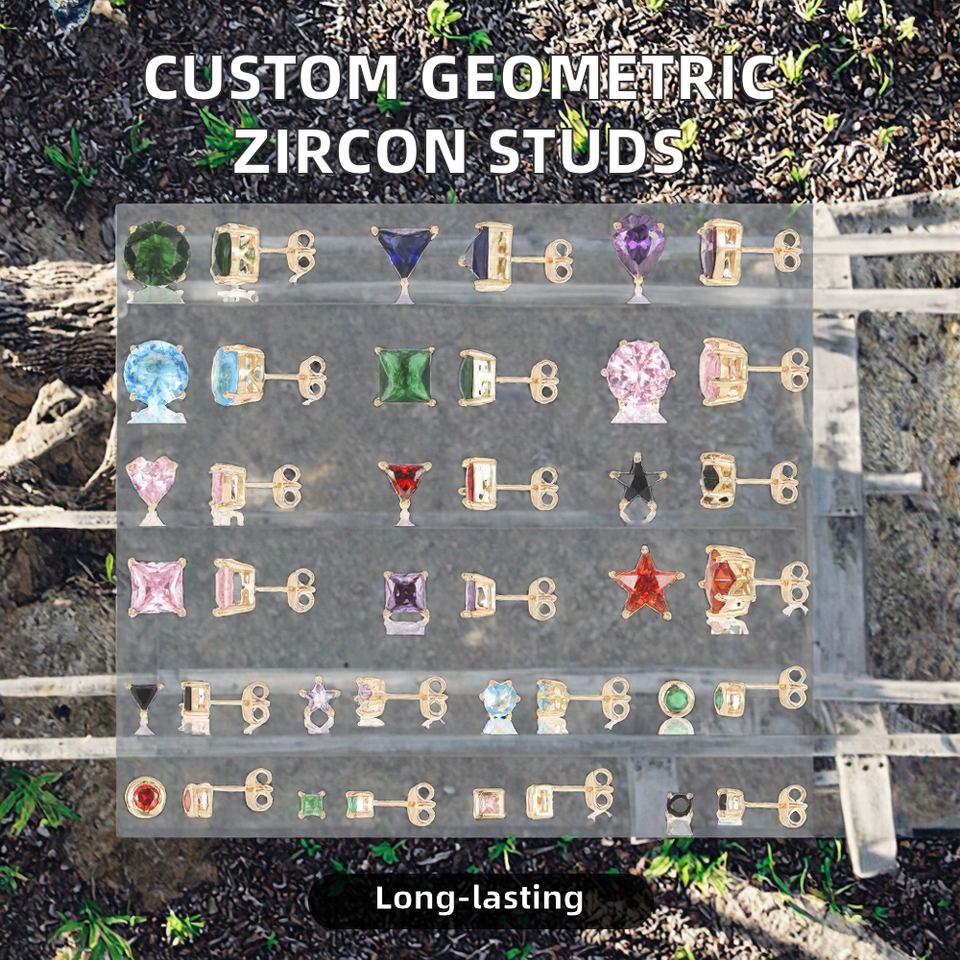 Ready To Ship Customized Brass Stud Earrings Multicolor Zircon Fashionable Geometric Shapes Waterproof Classic Imitation Diamond