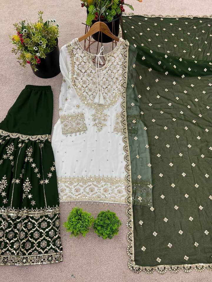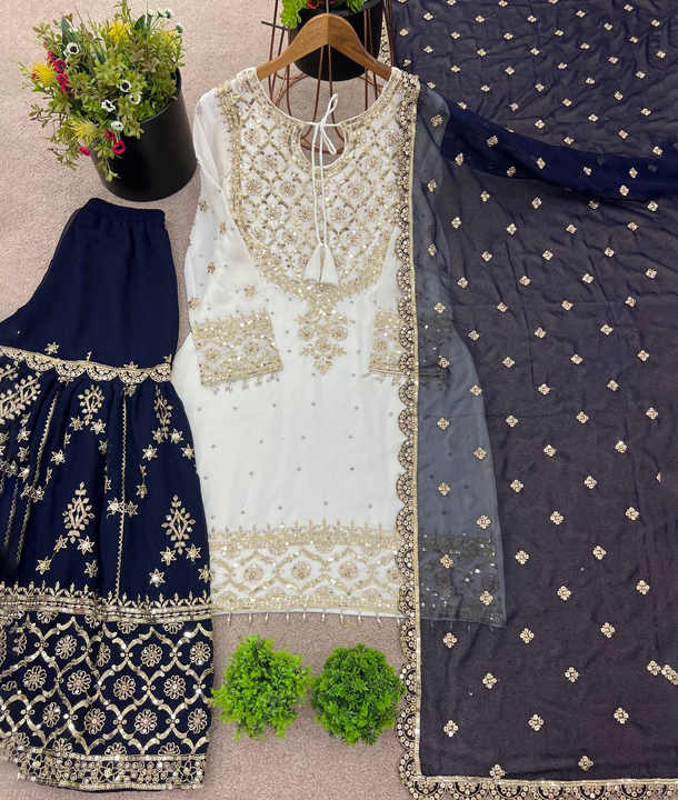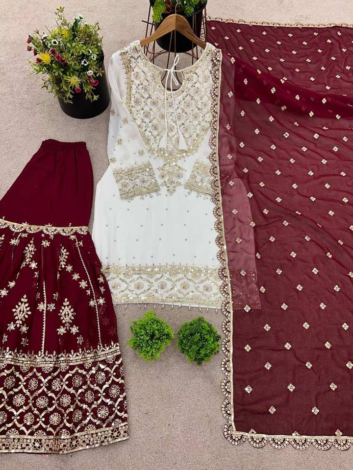 Readymade Indian Embroidery Work Sharara Gharara Kurti Set, Georgette Fabric, Pakistani Designer Ethnic Wear 3 Pcs Set