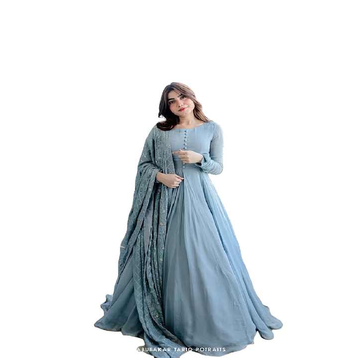 Readymade Indian Long Gown & Dupatta Set, Sky Blue Pakistan Dress, Flared Sequin Embroidered Party Outfit for Women