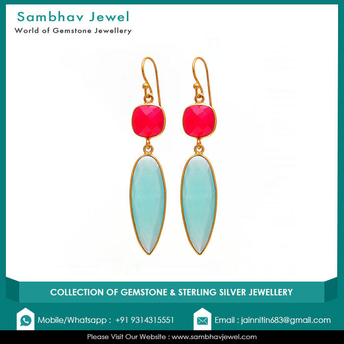 Real 925 Sterling Silver Women's Handmade Dangle Earrings Natural Fuchsia Aqua Chalcedony Gemstone Gold Plated Earrings For Gift