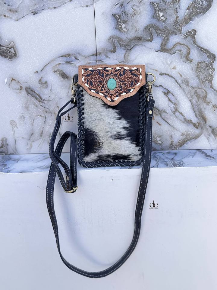 Real Cowhide Fur Hand Tooled Carving Turquoise Stone Sling Leather Bag Small Size Phone Purse and Handbag Wristlet Pouch