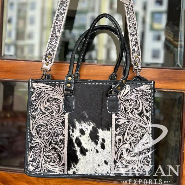 Real Cowhide Fur Tote Bag Stylish Leather New Designer Purse Hair on Hide Hand Tooled Carving Bags for Women's Multi Use