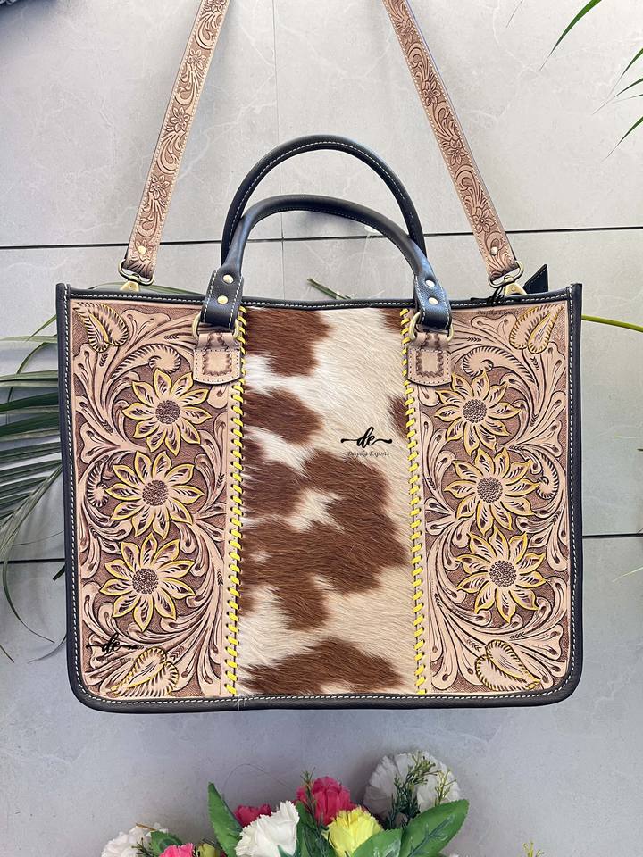 Real Cowhide Fur Tote Bag Stylish Leather New Designer Purse Hair on Hide Hand Tooled Carving Bags for Women's Multi Use
