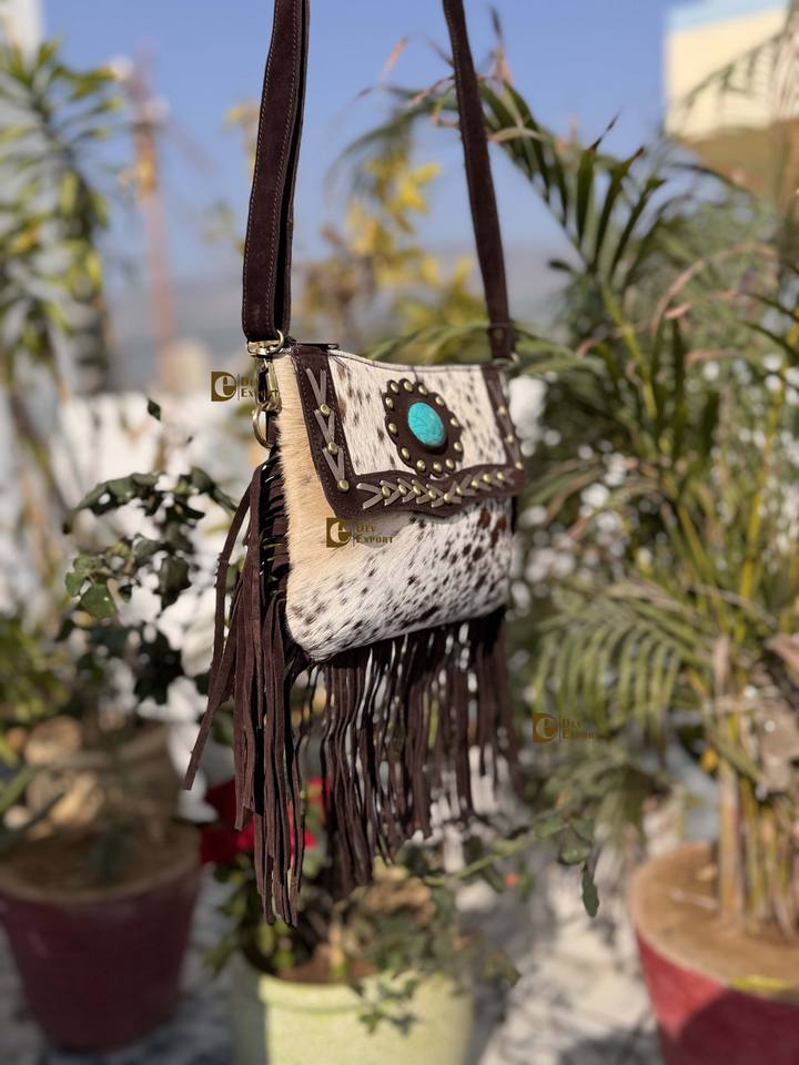 Real Cowhide Leather Fringe Handbag Turquoise Stone Stylish Bohemian Tassel Sling Bag Multi-Use Zipper Hot Sale Fringe Bag
