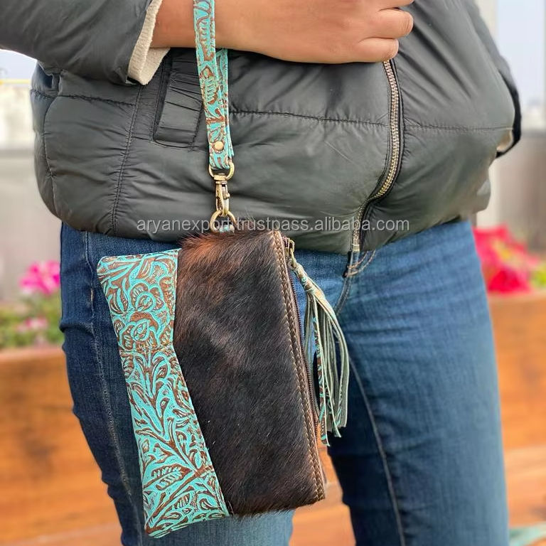 Real Cowhide Leather Wristlet Clutch Purse Pouch Brown Wallet Carving Tooled Western Patches Hair on Hide Fur Leather Clutch