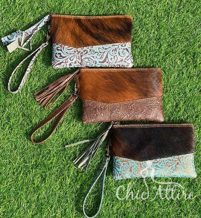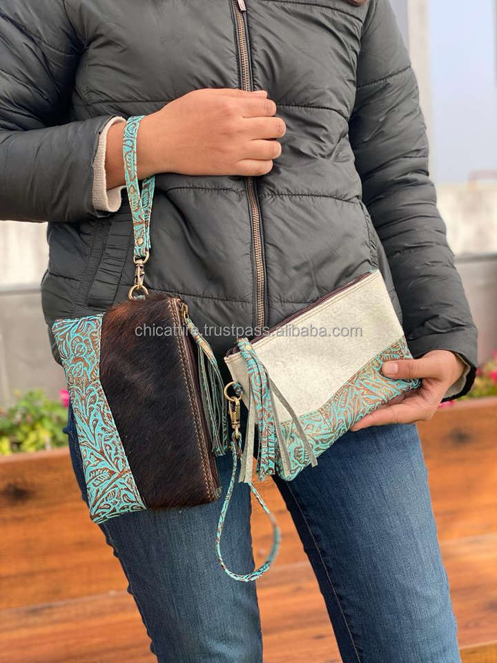 Real Cowhide Leather Wristlet Clutch Purse Pouch Brown Wallet Carving Tooled Western Patches Hair on Hide Fur Leather Clutch