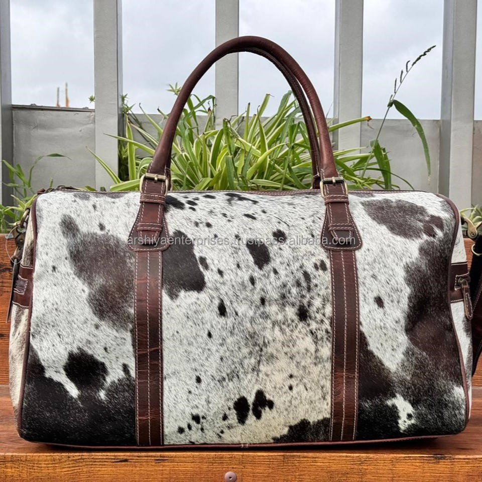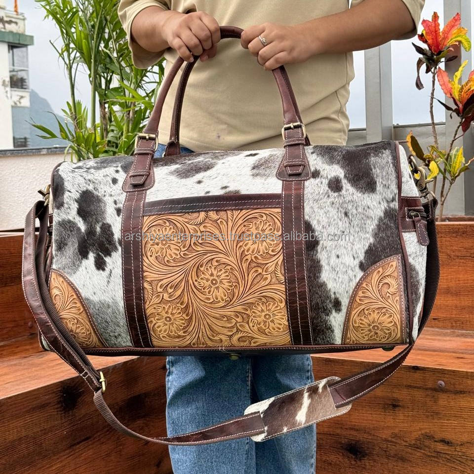 Real Full Grain Cowhide Leather Duffle Bag Personalized Hair on Tooled Leather Weekender Bag Overnight Travel Bags for Unisex