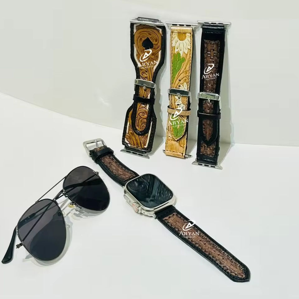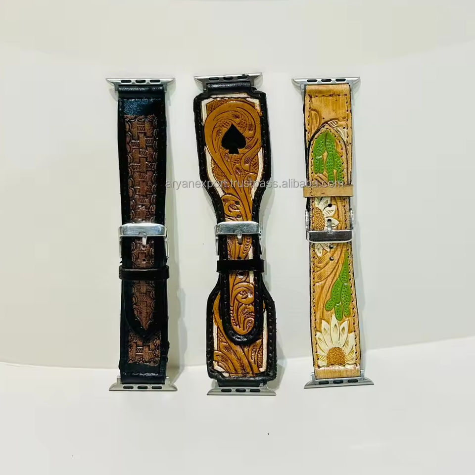 Real Genuine Hand Made Tooled Stamped Embossed Leather Floral Colorful Western Southwest Compatible Standard Watch Band Straps
