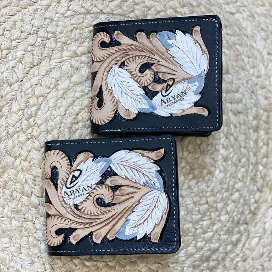 Real Hand Tooled Leather Men's Wallet Long Zipper Bifold Wallet Hot Selling Black Tooling Money Card Holder Wallets Gift for Him