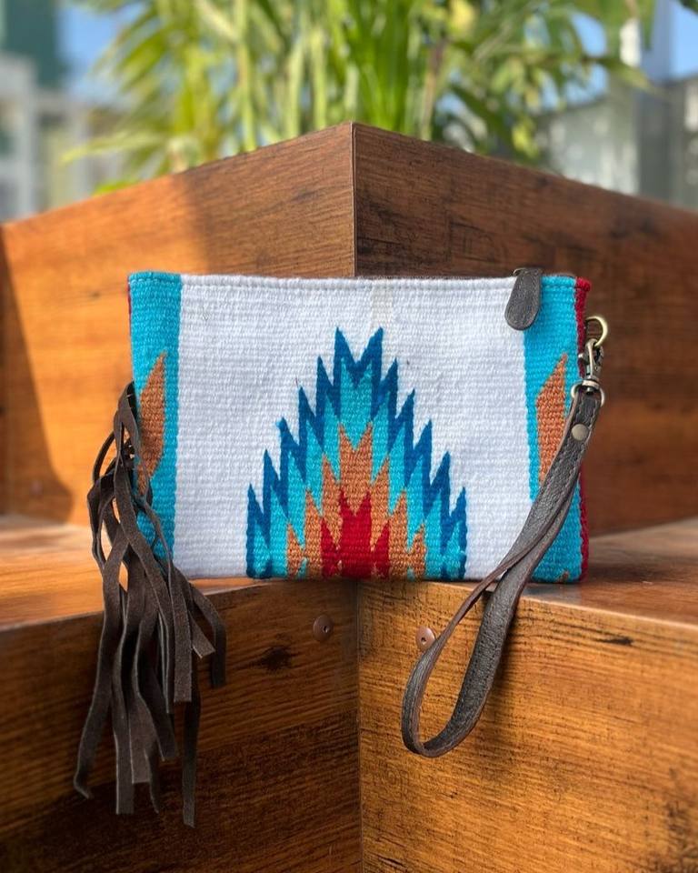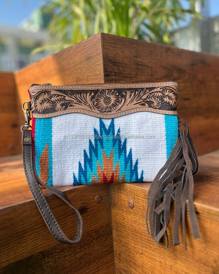Real Handmade Aztec Tooled Leather Clutch Stylish Women Saddle Blanket Fringe Wallet High Quality Tooled Leather Wristlet Clutch