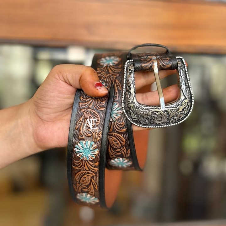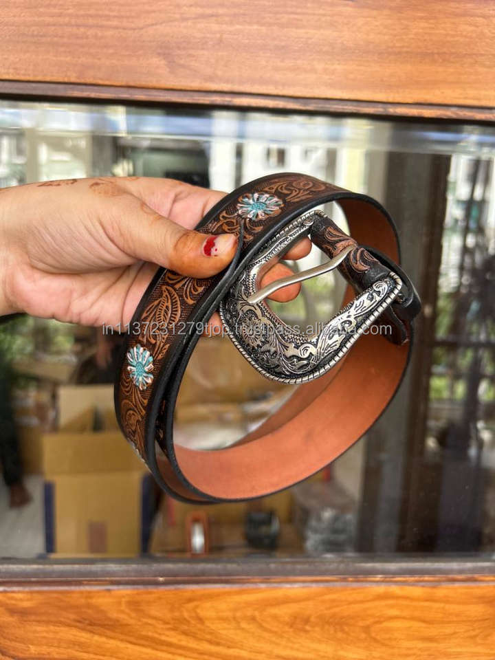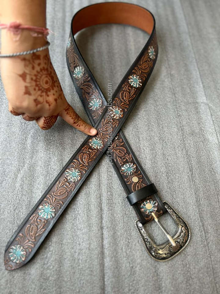 Real Handmade Genuine Leather Western Hand Tooled and Hand Painted Floral Belt New Arrival Tooled Leather Unisex Waist Belt