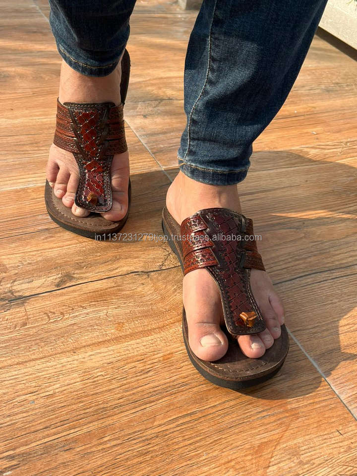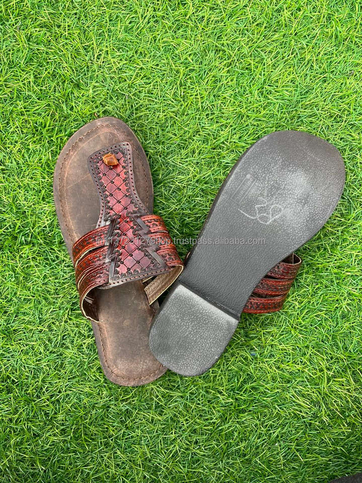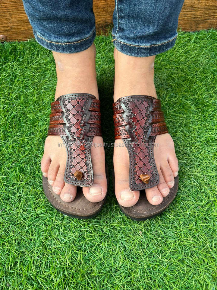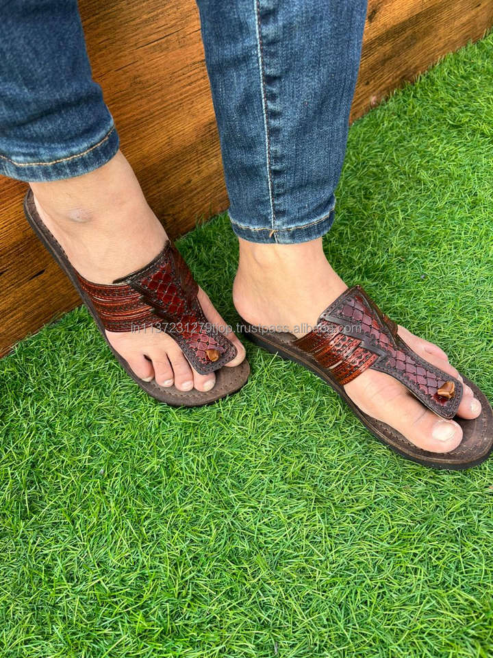 Real Handmade Genuine Women Western Style Tooled Cowhide Leather Casual Outdoor Flipflop Flat Brown Footwear Open Toe Sandal