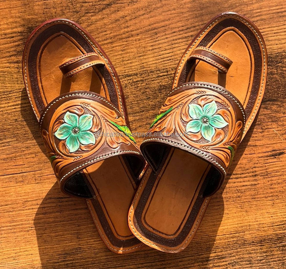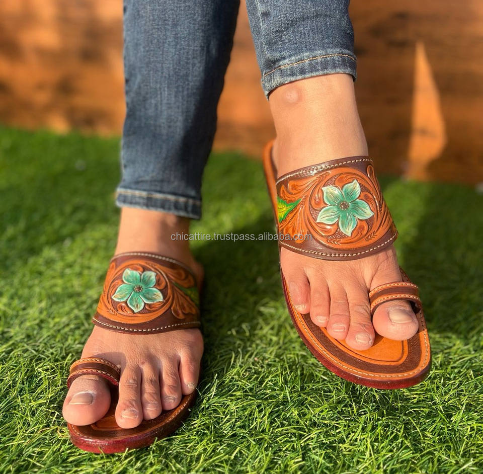 Real Handmade Genuine Women Western Style Tooled Cowhide Leather Casual Outdoor Flipflop Flat Turquoise Footwear Open Toe Sandal