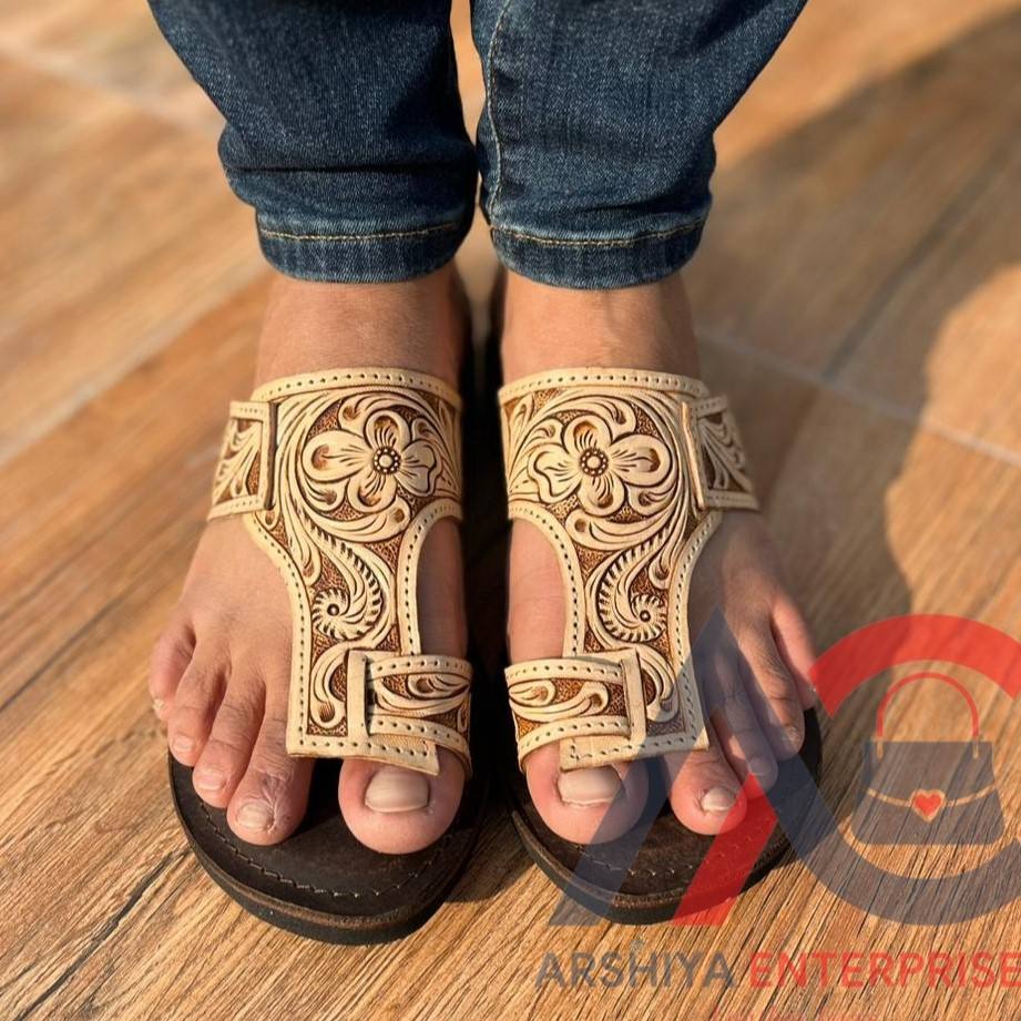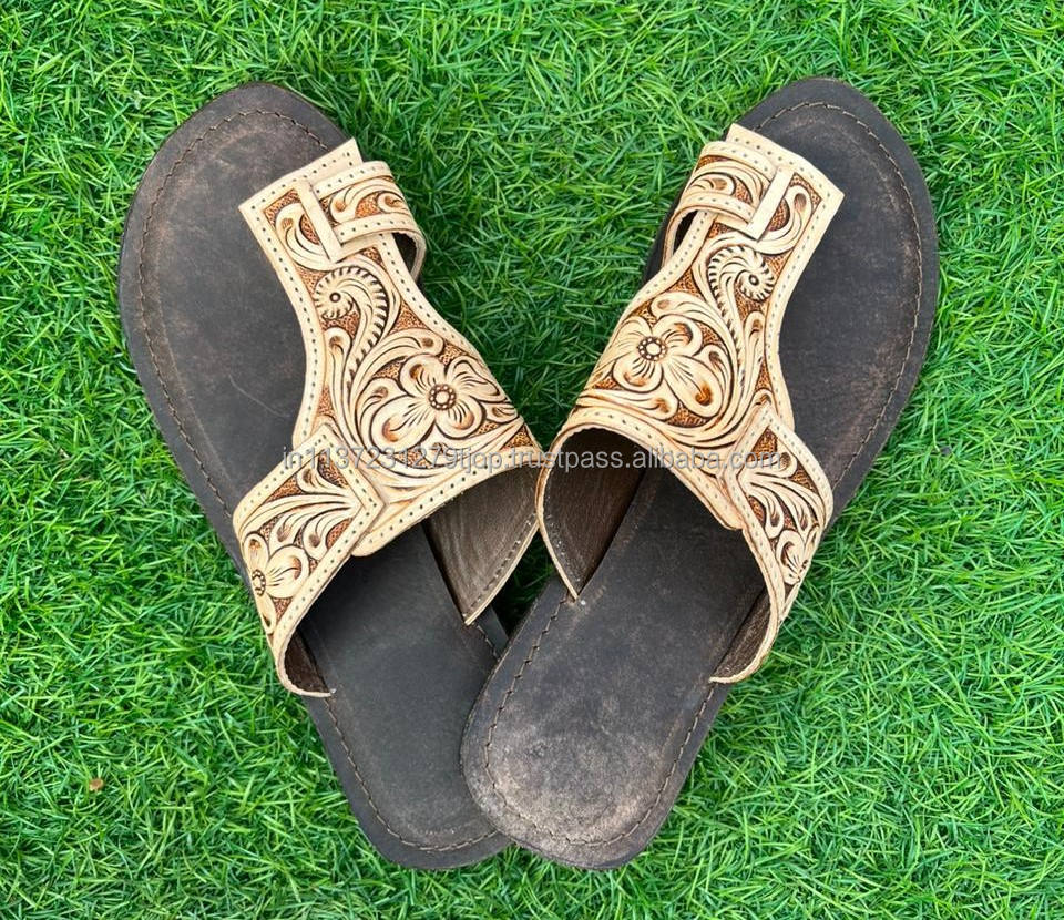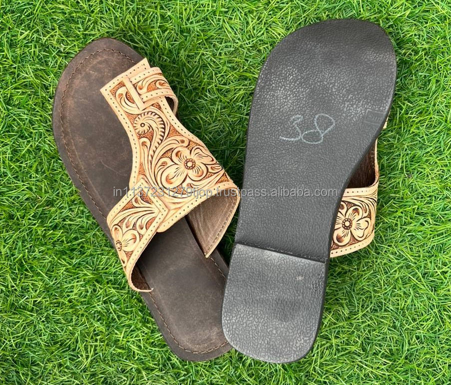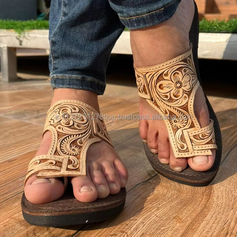 Western Style Real Handmade Genuine Tooled Leather Women Casual Comfort Flipflops Flat Flower Footwear Open Brown Toe Sandals