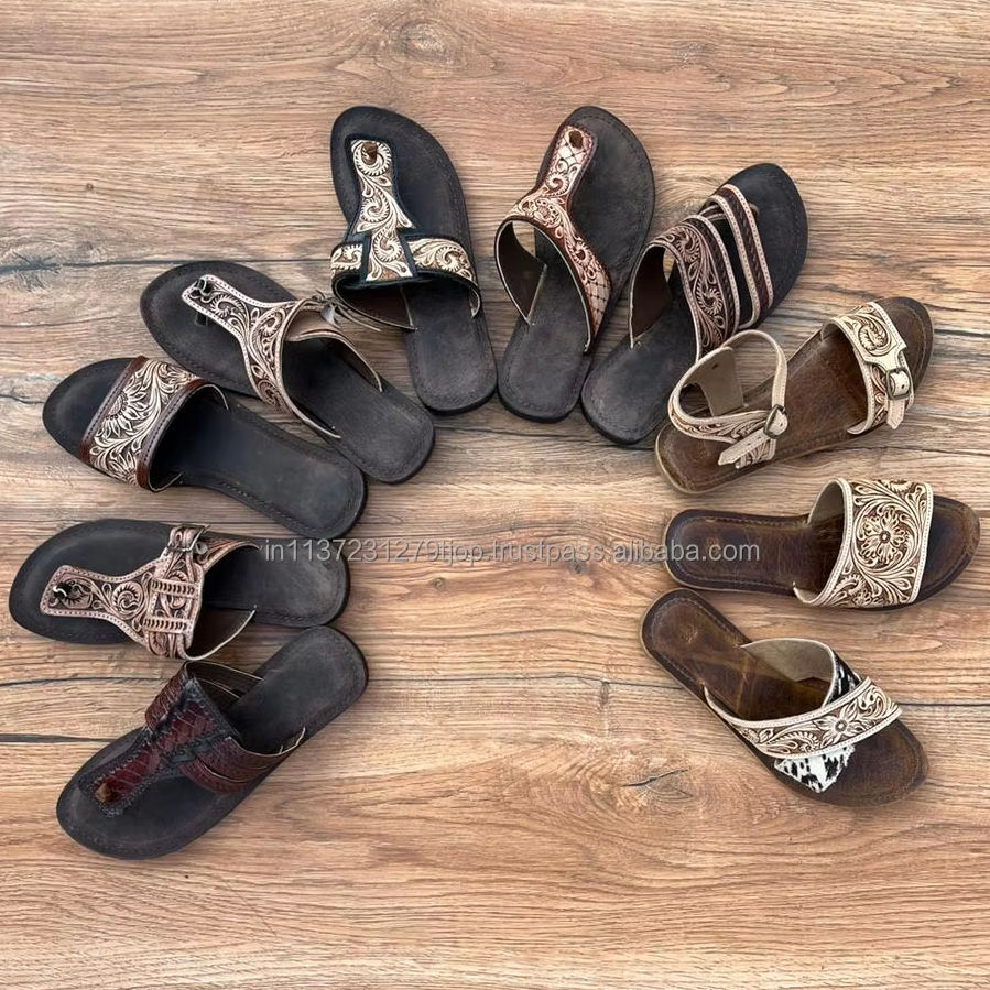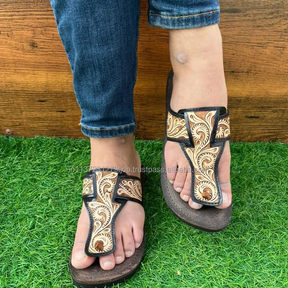 Real Handmade Genuine Women Western Style Tooled Cowhide Leather Casual Outdoor Flipflop Flat Brown Footwear Open Toe Sandal