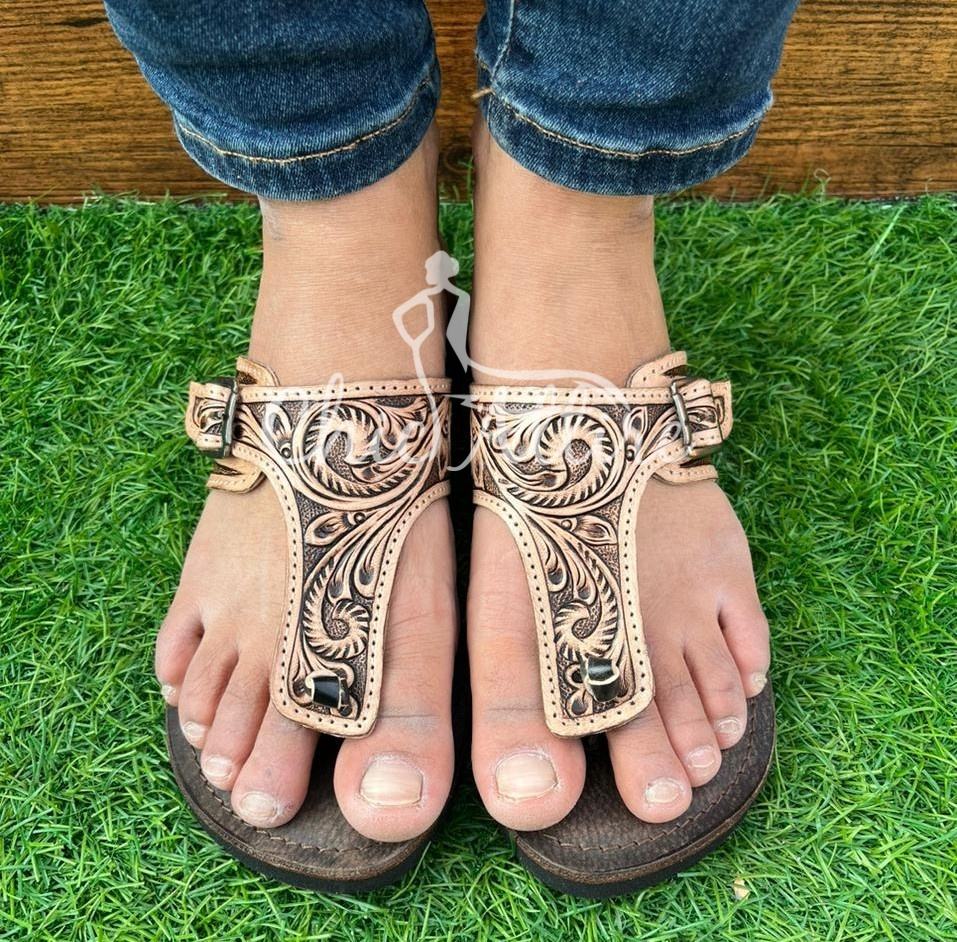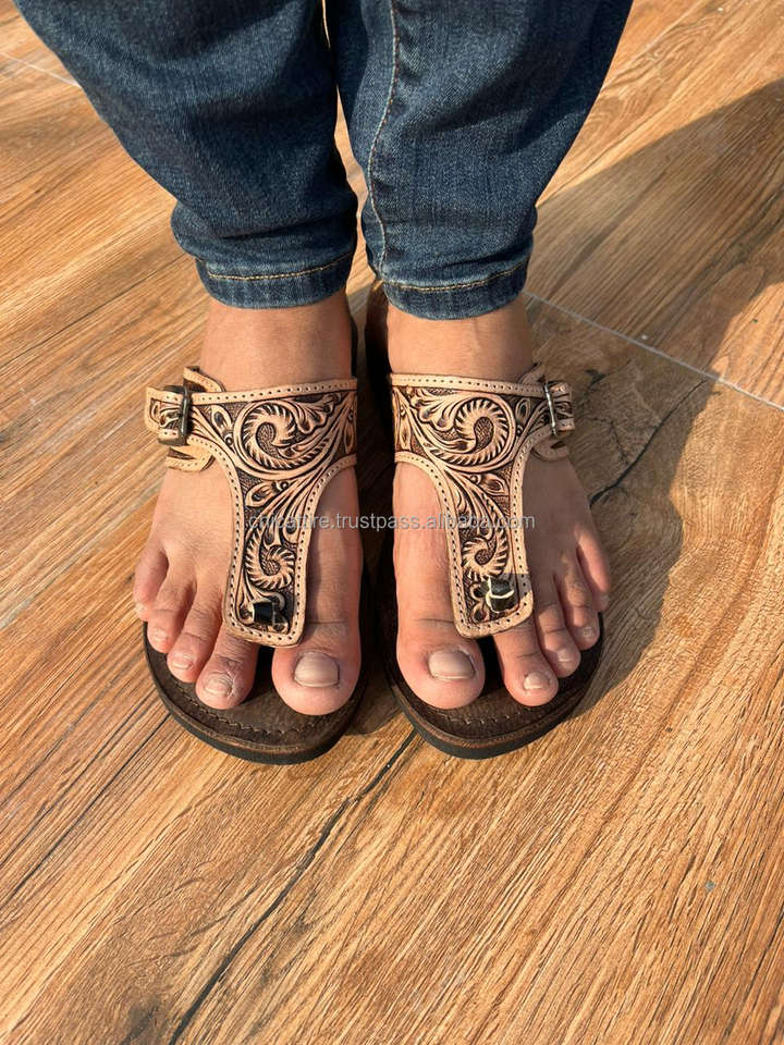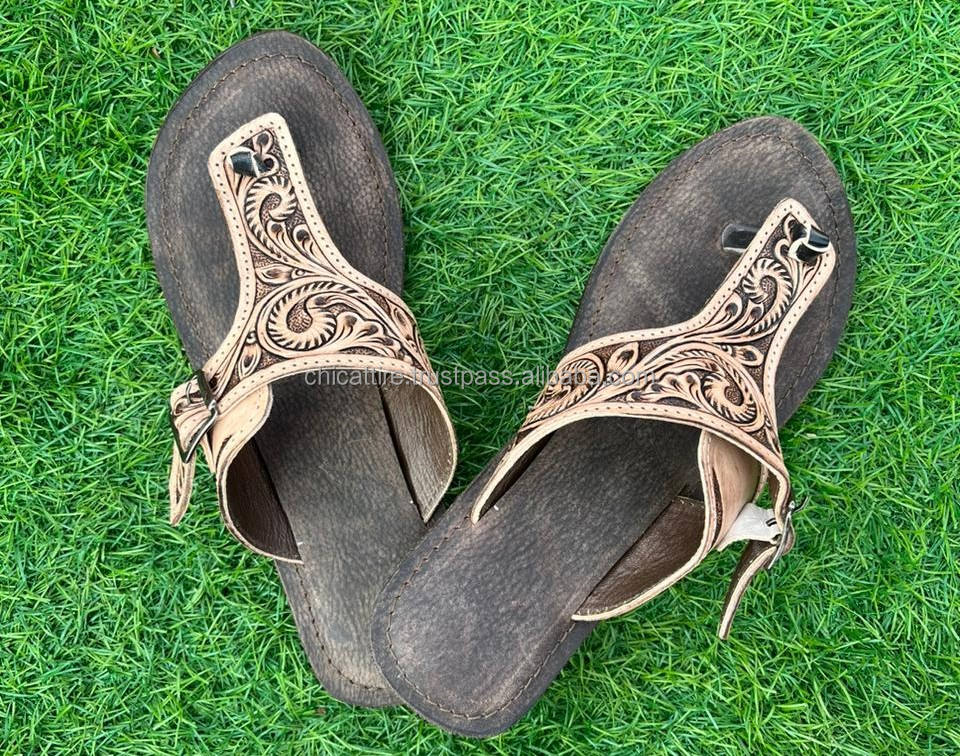 Real Handmade Genuine Women Western Stylish Tooled Leather Casual Outdoor Flipflop Flat Flower Footwear Open Brown Toe Sandals