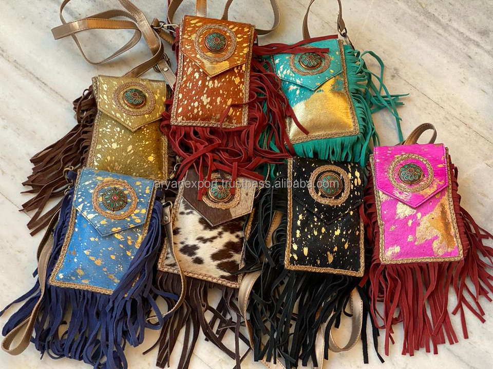 Real Handmade Metallic Fur Leather Fringe Bag Women Stylish Cowhide Fur Mobile Phone Pouch Belt Sling Shoulder Bag