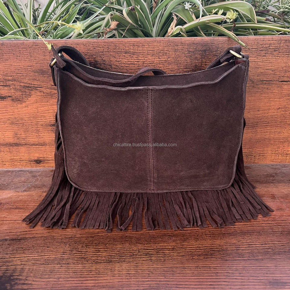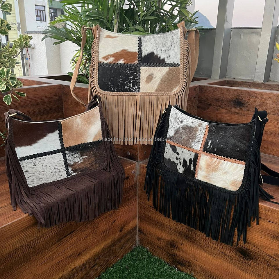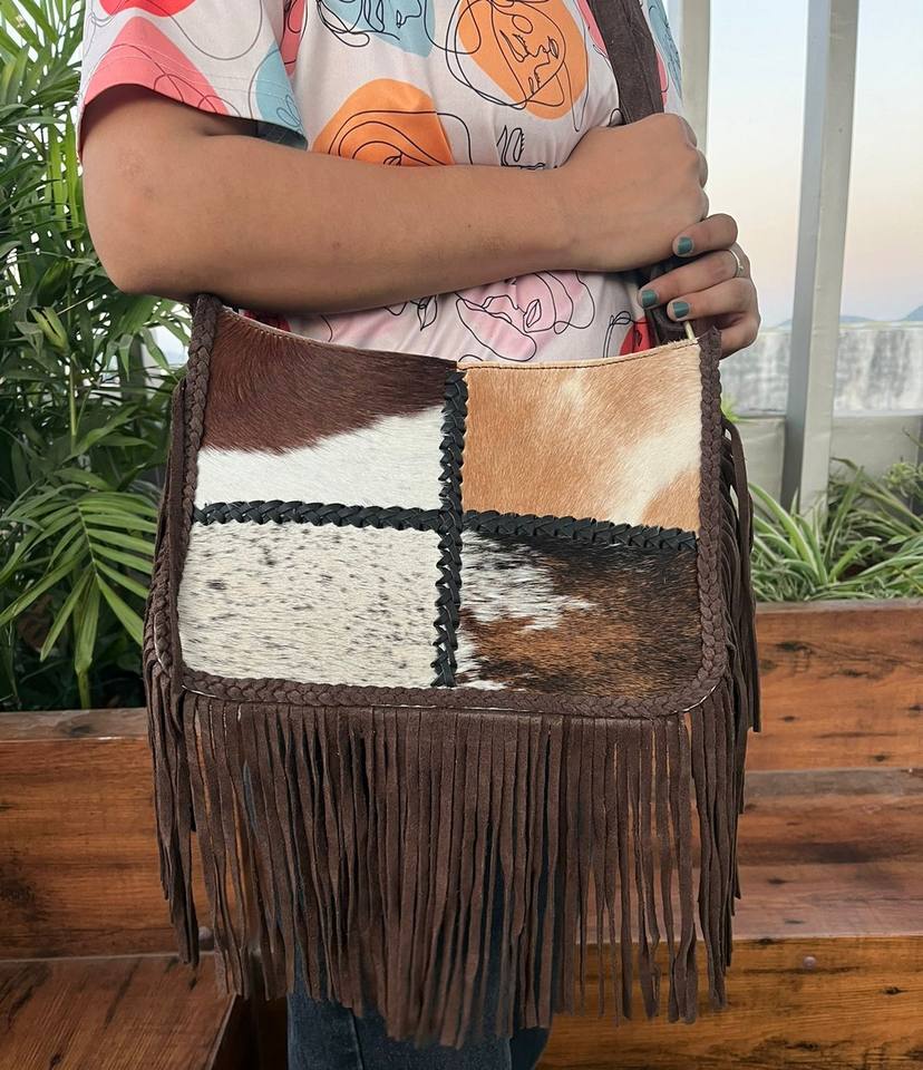 Real Handmade Suede Leather Bohemian Hobo Style Bag with Fringes Hair on Cowhide Crossbody Purse for Women Western Hippie Bag
