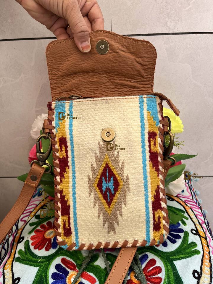 Real Jacquard Leather Phone Purse Handbag Lightweight Small Size Sling Bag Aztec Saddle Pouch Design Hand Tooled Carving