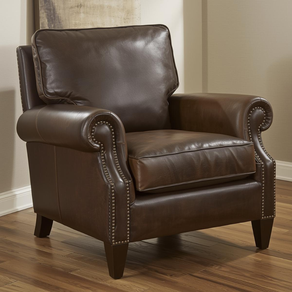Real Leather Armchair Premium Quality Traditional Upholstered Accent Chair Rolled Arm Design Nailhead Trim for Living Room