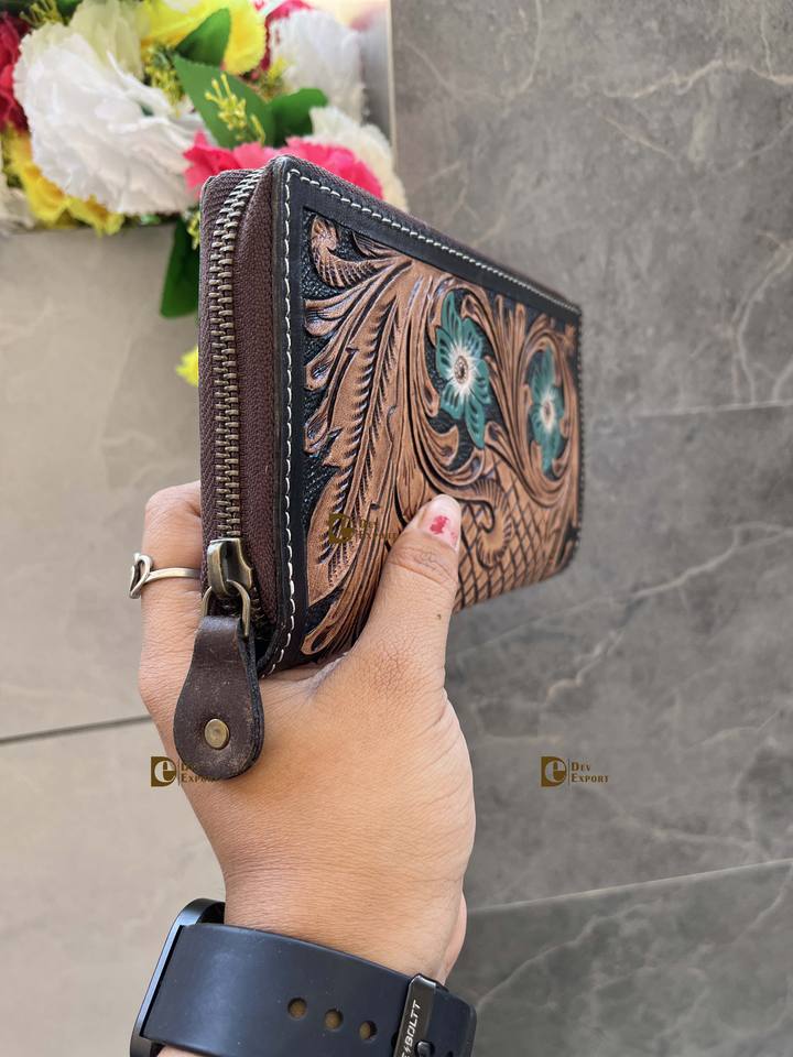 Real Leather Hand Tooled Leopard Pattern Summer Fashion Waterproof Multi-Purpose Women Clutch Handbag