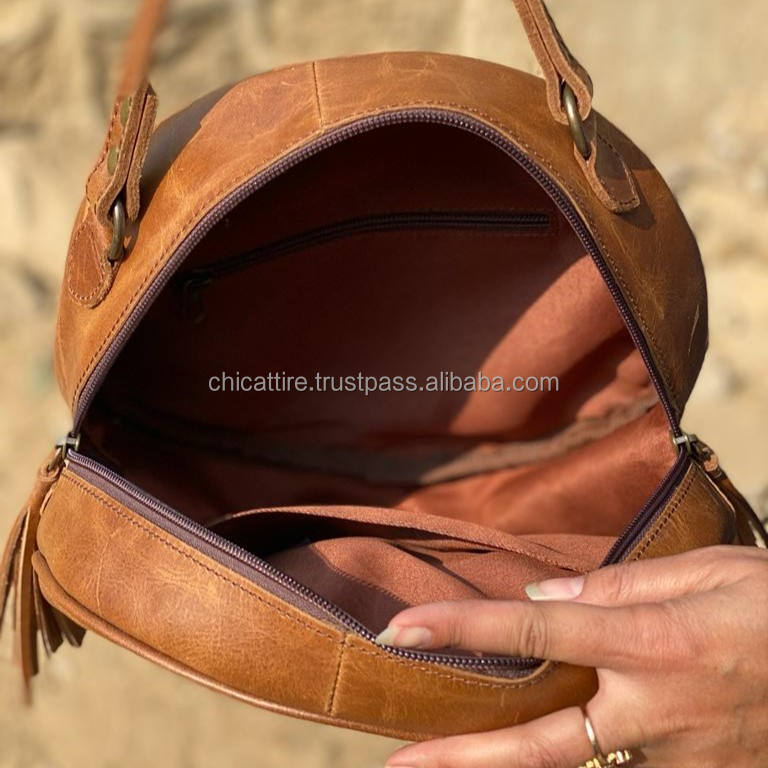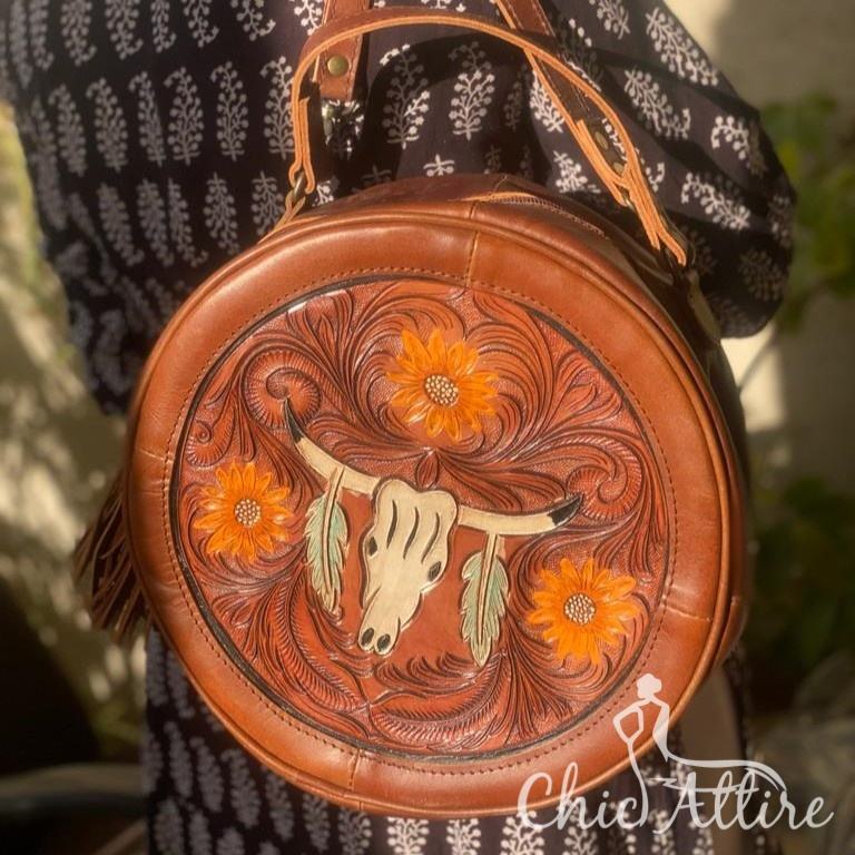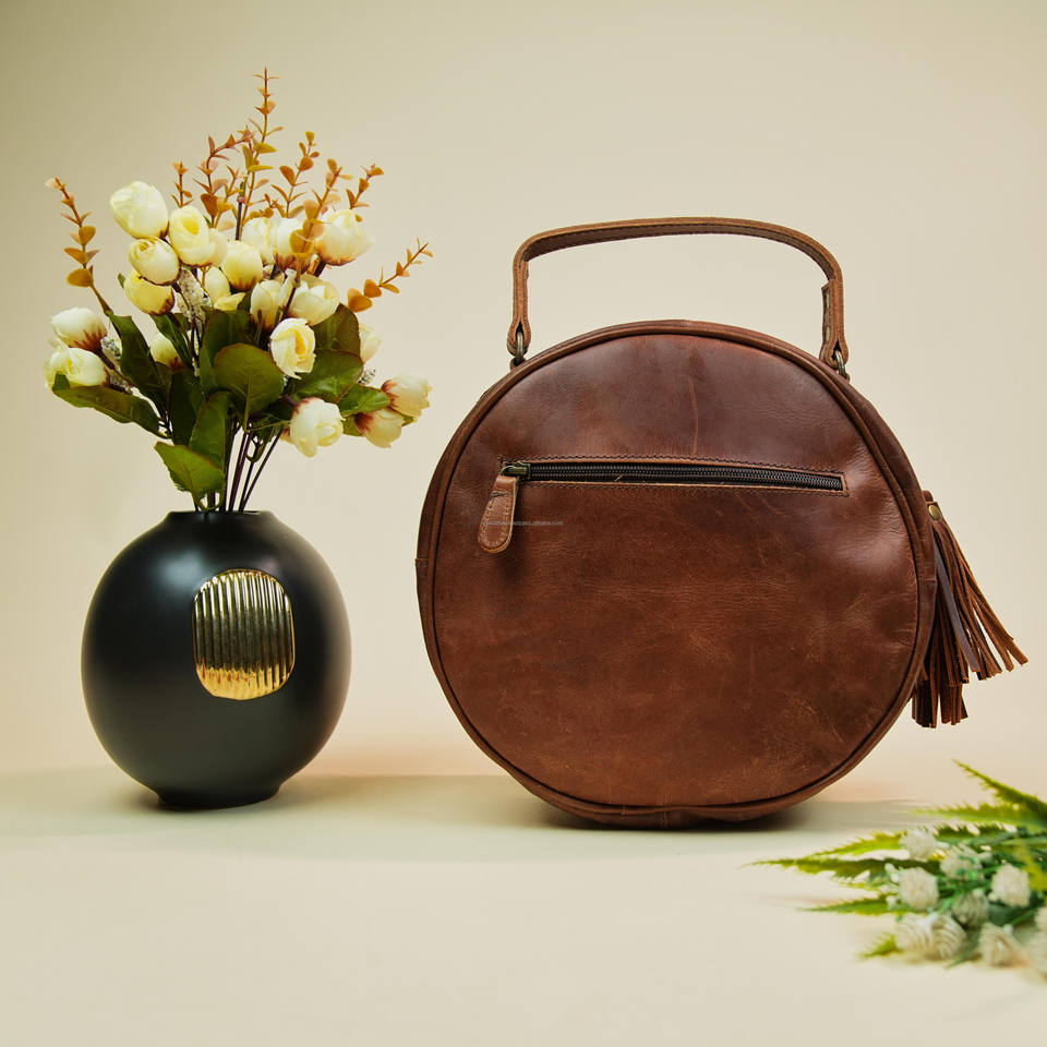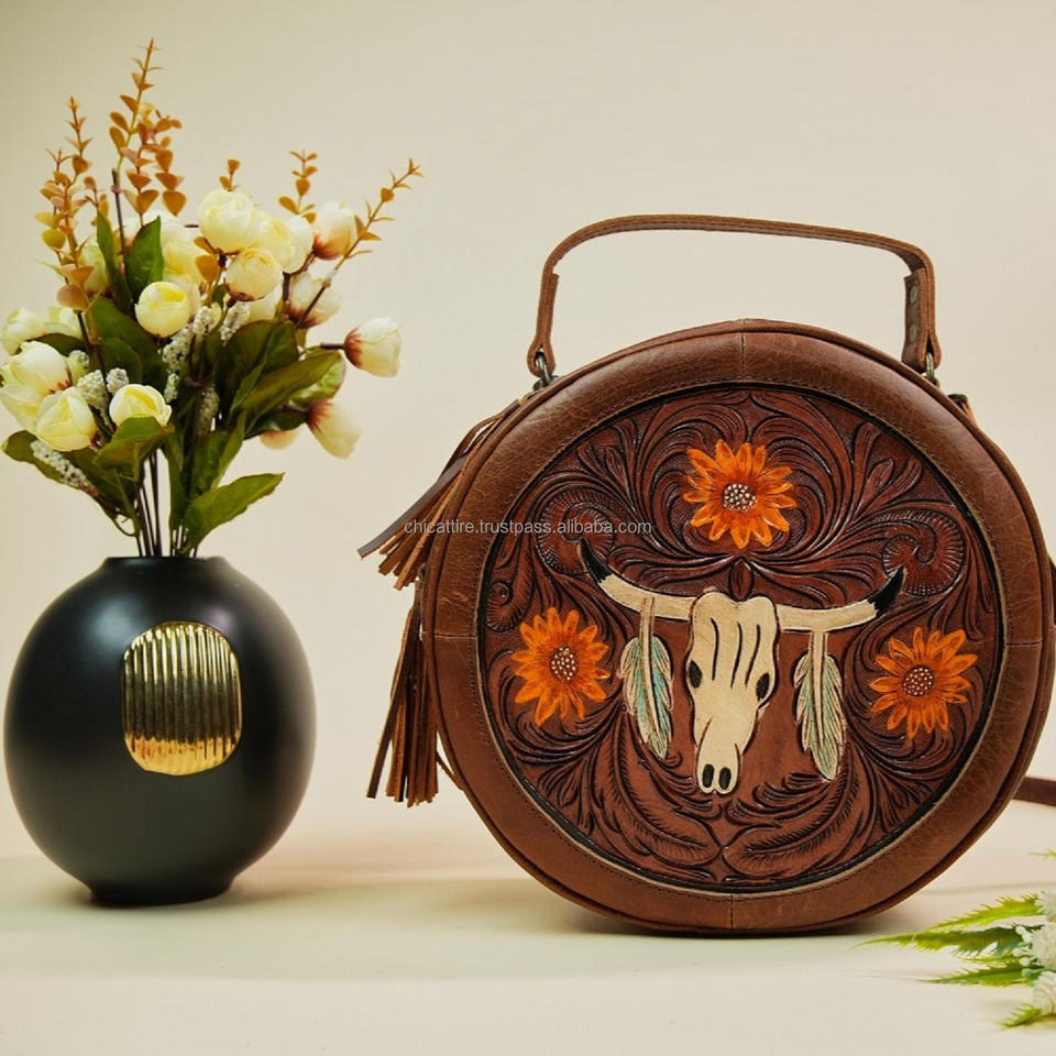 Product name:Hand Tooled Leather Round Crossbody Bag