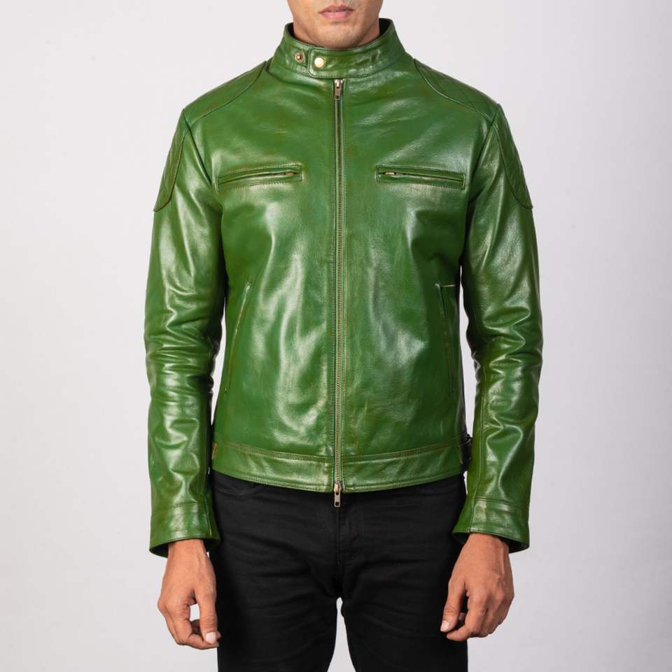 Real Leather Sheepskin Aniline Zipper Gatsby Green Men Biker Jacket with Quilted Viscose Lining and Inside jacket for men