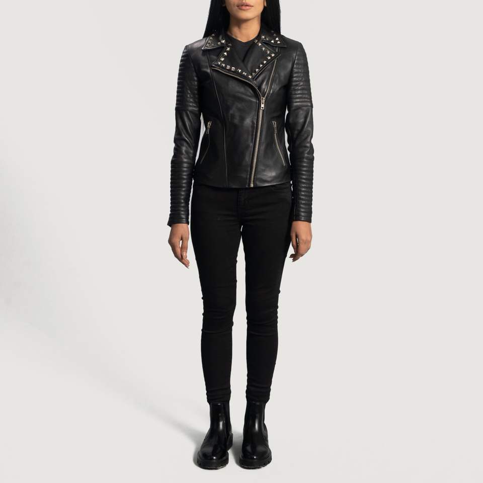 Real Leather Sheepskin Aniline Zipper Sally Mae Studded Black Women Biker Jacket with Quilted Viscose Lining and Inside Outside
