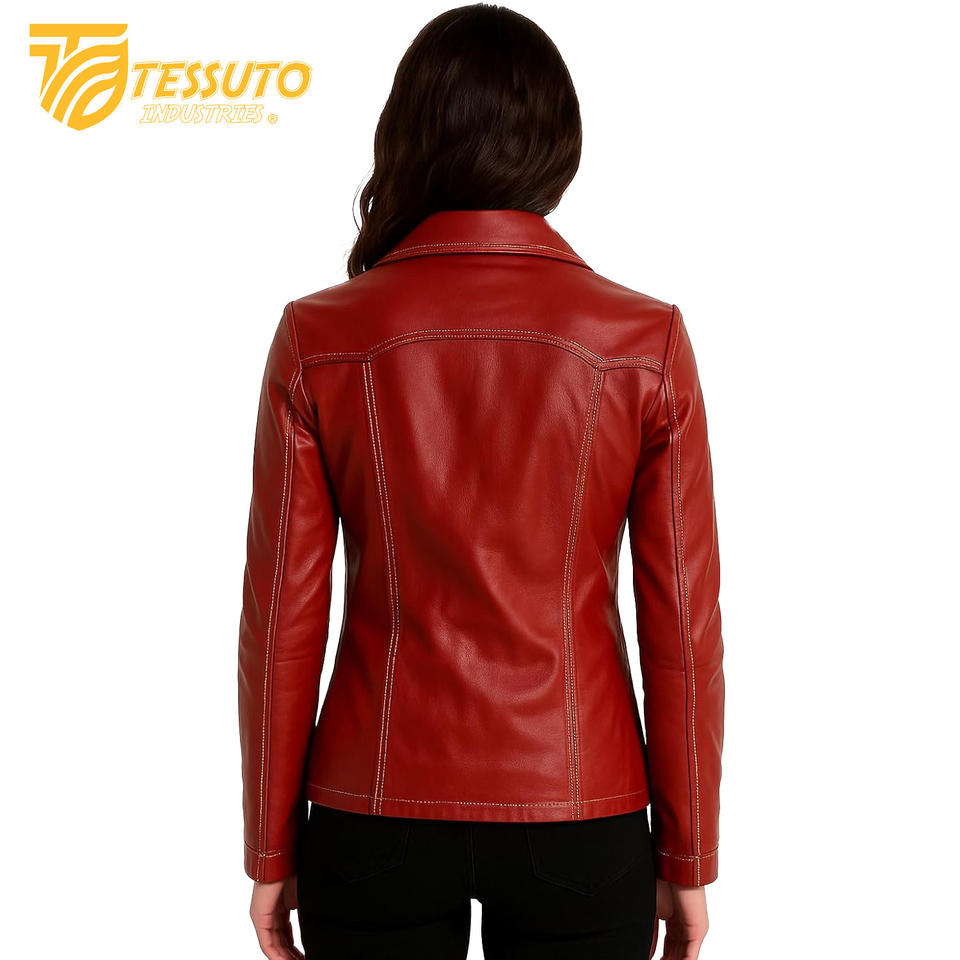 Real Leather Women's Biker Jacket Aniline Sheepskin with Zipper Flashback Red Quilted Viscose Lining Inside Outside Pockets