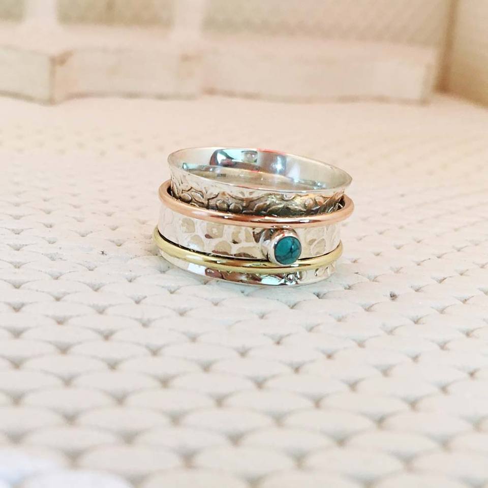 Real Pure 925 Sterling Silver & Copper Brass Spinner Ring Wholesale Price Turquoise Gemstone Three Tone Fashionable Spinner Ring
