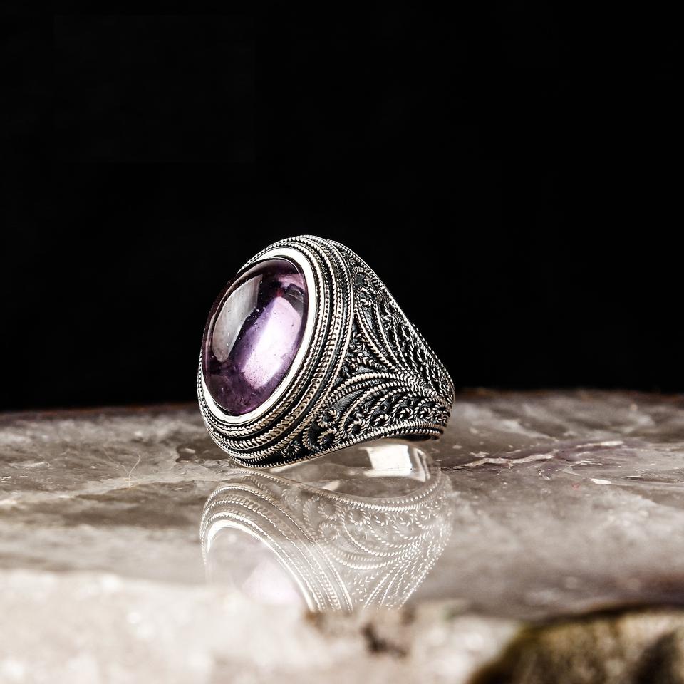 Real Pure 925 Sterling Silver Ring Handmade Turkey Luxury Vintage Style Trendy Model Featuring Amethyst Crystal Stone