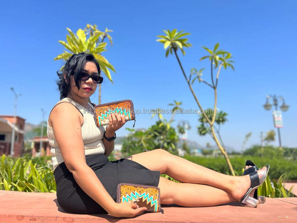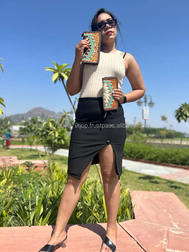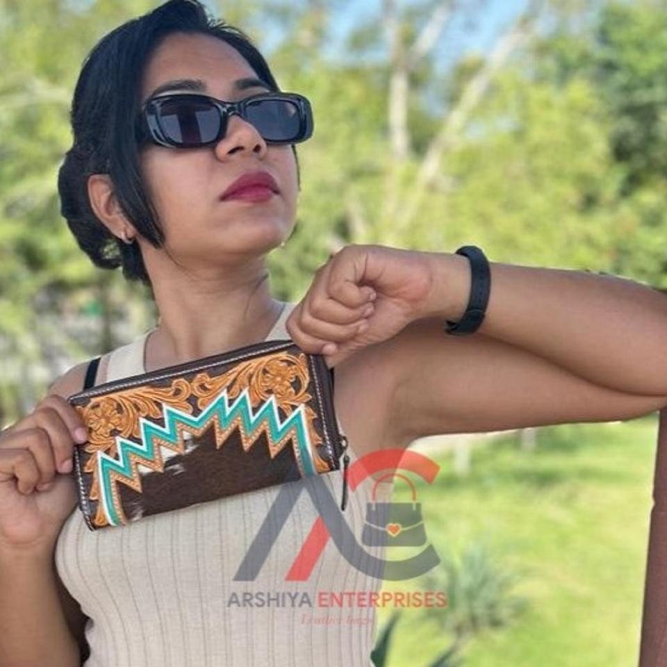 Real Western Style Hair on Hide Colorful Tooled Fur Leather Clutch Women Designed Purse Hot Selling Tooled Leather Zipper Wallet