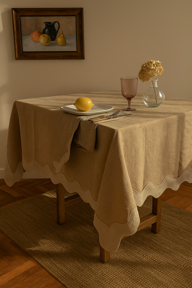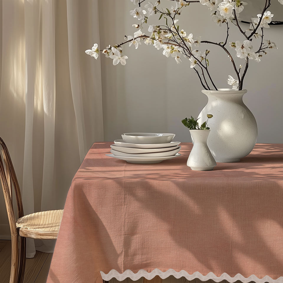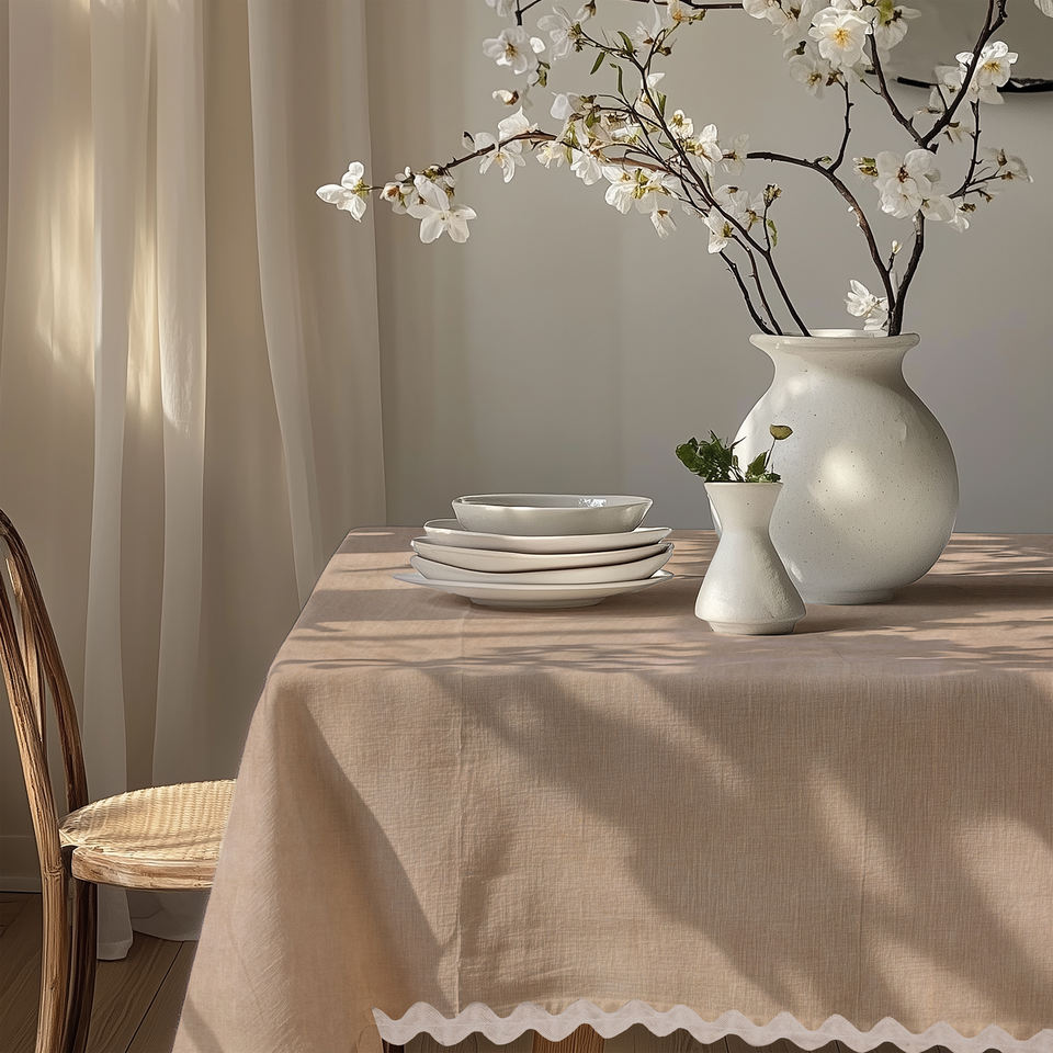 Rectangle Large Size Cotton Linen-look Soft Table Decor Piping Scallop Edge Fabric Tablecloth for Wedding Party Rental