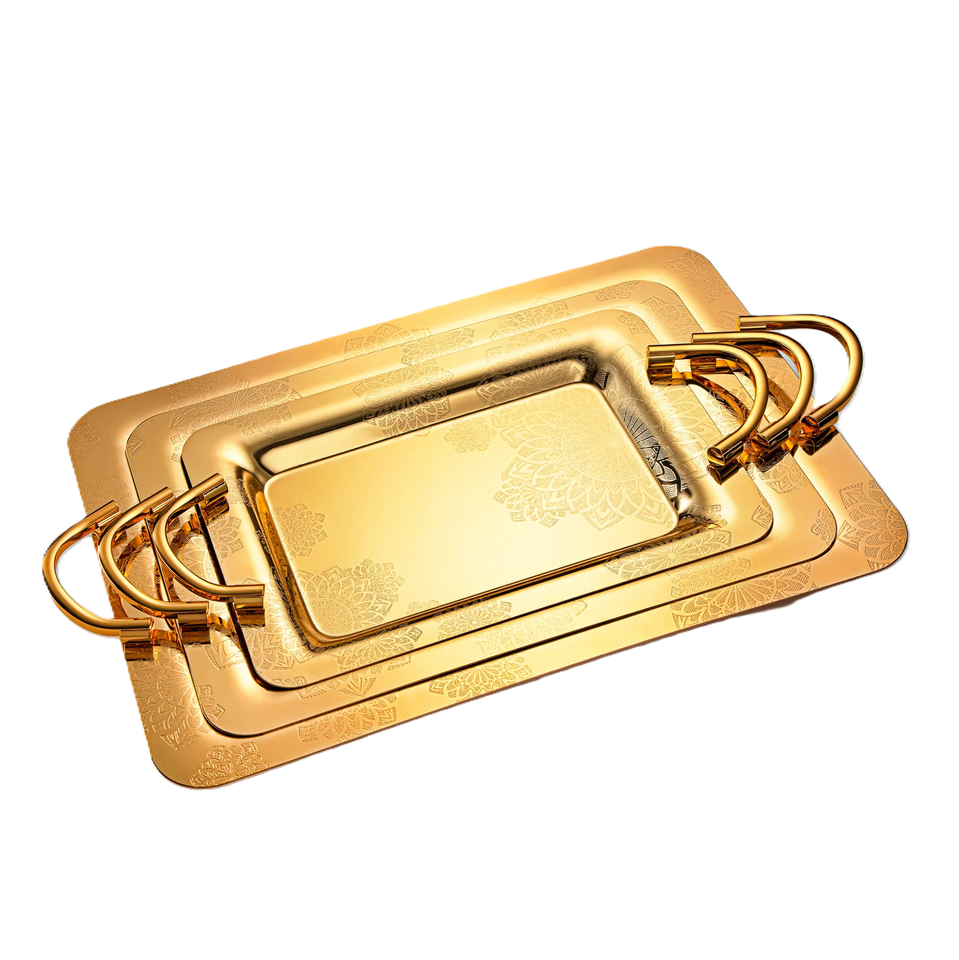 Rectangle Shape Hotel & Restaurant Tabletop Food & Drink Serving Trays SET of 3 Trending Metal Gold Serving Tray With Handle