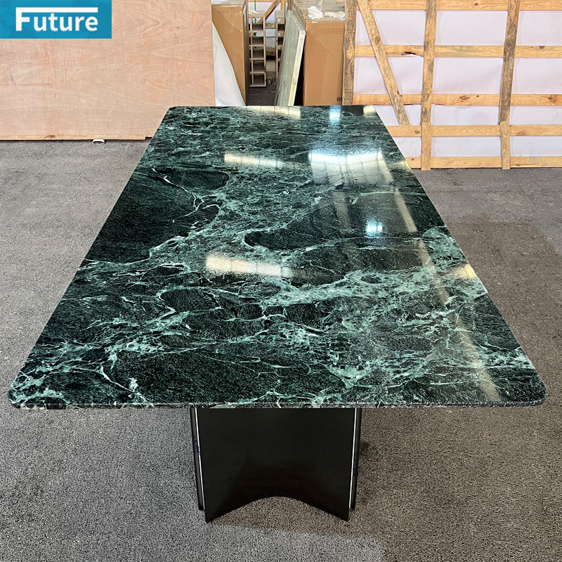 Rectangle Top Verde Green Marble Dining Table with Black Metal Leg for Villa Mansions Apartment Hotel Restaurant 6 Seater