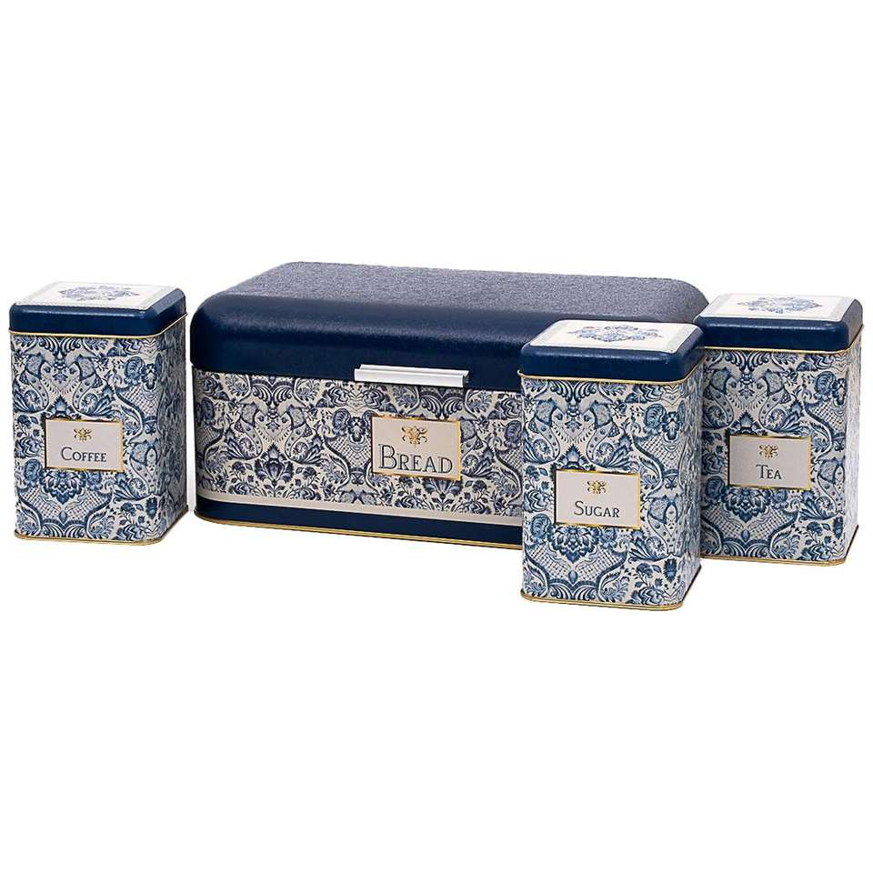 Rectangular Bread Box and Square Tin Box set ( 4 Pcs) Hinged Lid Azulejo-Inspired Blue & White Decorative Pattern Azulejos