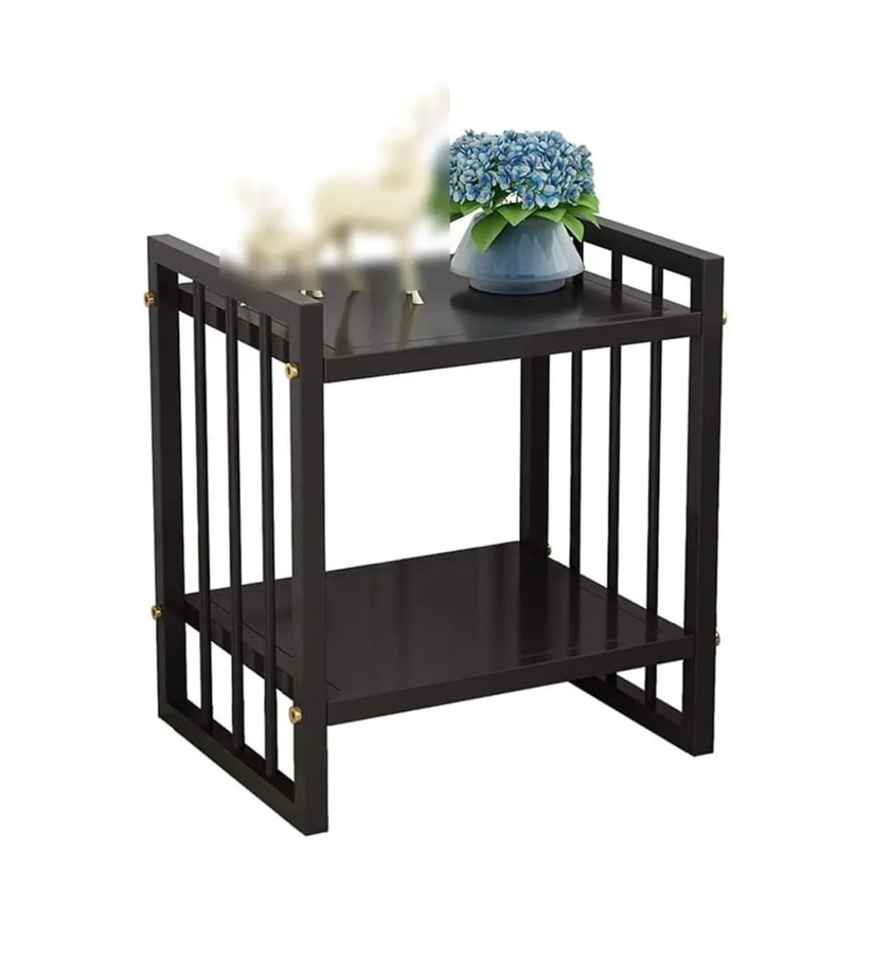 Rectangular Dark Wood Side Table With Dual Tier Slatted Design Golden Bolt Accents Modern Rustic Accent Furniture For Home