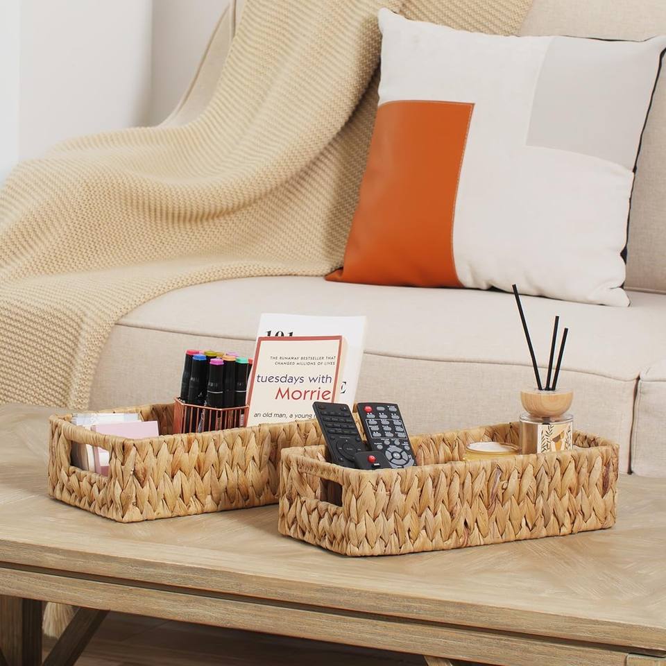 Rectangular Water Hyacinth Woven Storage Basket with Handles 13"D X 8.25"W X 7"H Multifunction for Organizing Books Kitchen Use