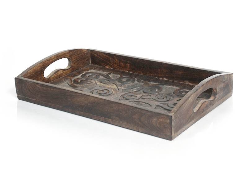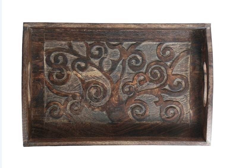 Rectangular Wooden Serving Tray with Tree of Life Design Engraving and Holding Handles Table Kitchen Decor Tray