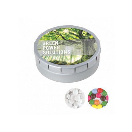 Approx. 12g Recyclable round Click Metal Tin Box with PVC Plastic 45mm featuring Minties PAD PRINTING Wood Paper Tin Materials