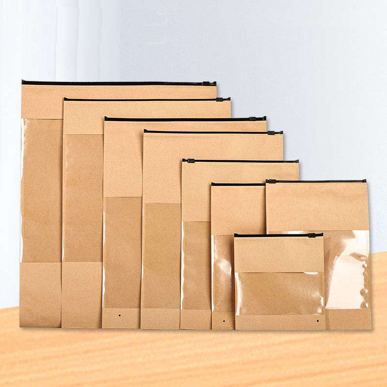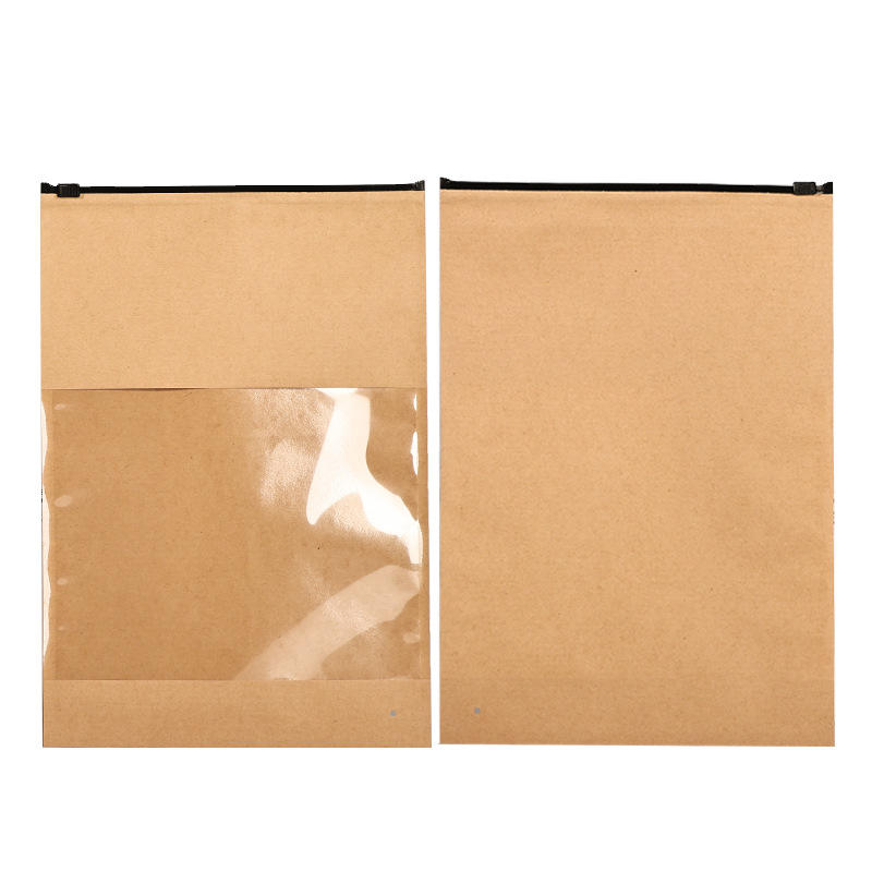 Recyclable Plastic Brown Kraft Zipper Bag Jeans Dress T-shirt Hoodie Packaging Garment Bags Paper Ziplock Bag with Clear Window