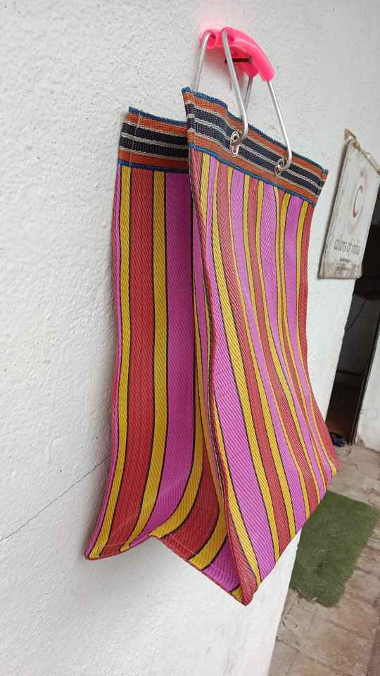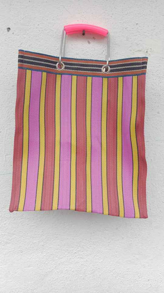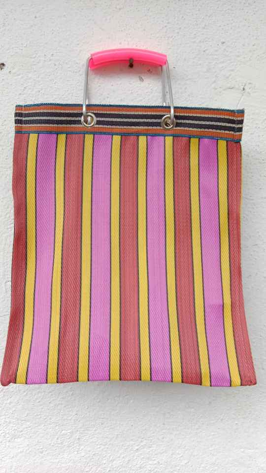 Recycled Nylon Eco-Friendly Large Capacity Reusable Market Bag with Metal Handle Striped Handloom Woven Design