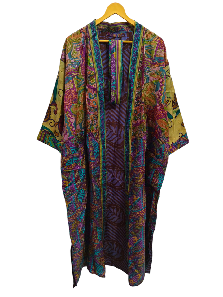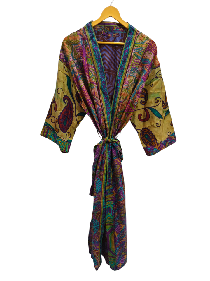 Recycled Sari Silk Free Size Bathrobe Night Wear Long Robe, Floral Print Indian Vintage Recycled Silk Sari Kimono,